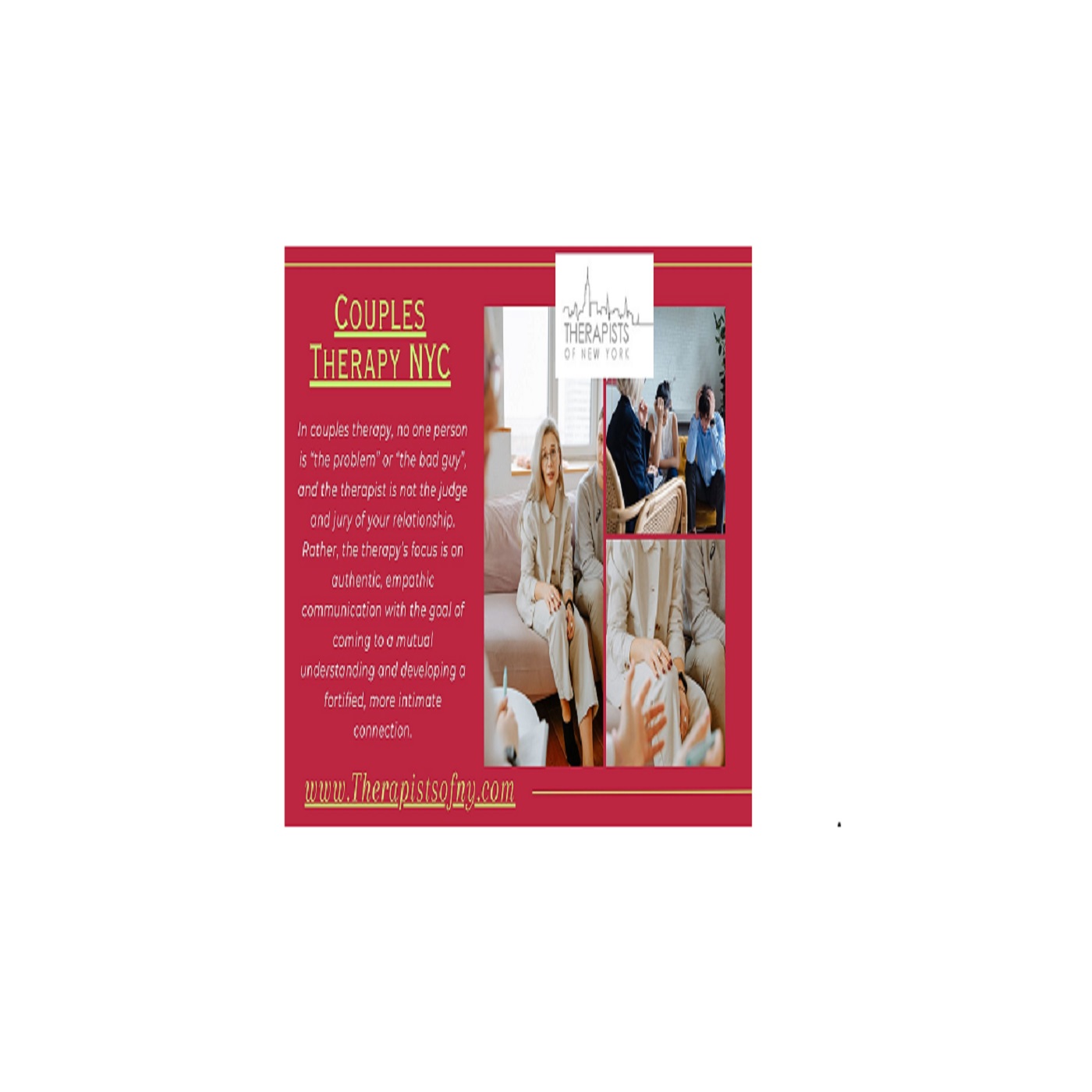 Are you and your partner facing challenges in your relationship? Our Couples Therapist in NYC is here to help! With years of experience and a compassionate approach, we specialize in guiding couples through difficult times and enhancing intimacy. Contact us at https://www.therapistsofny.com/couples-therapy